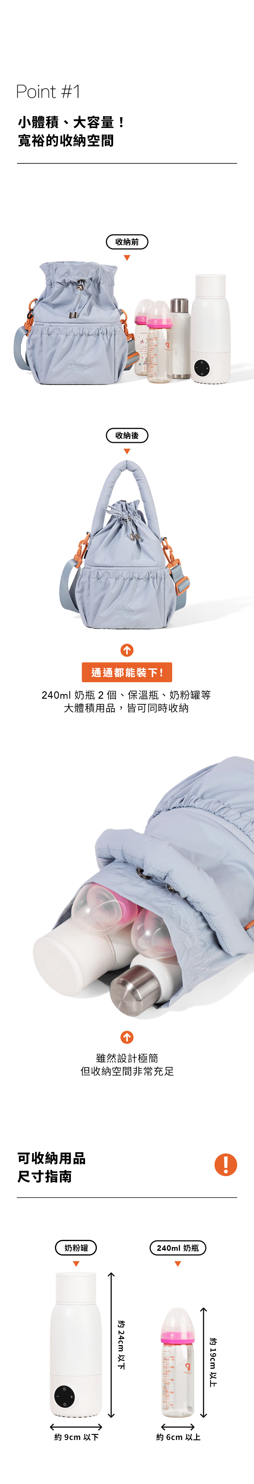 • 小體積大容量:體積精巧卻能輕鬆收納奶瓶等