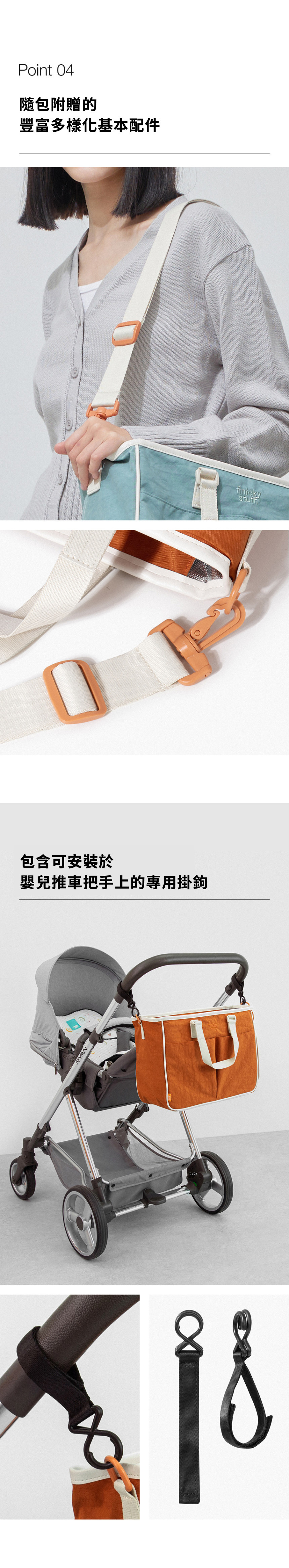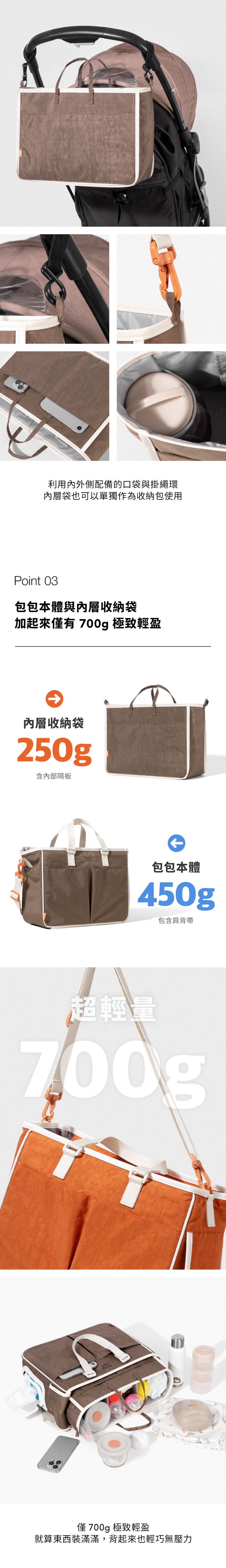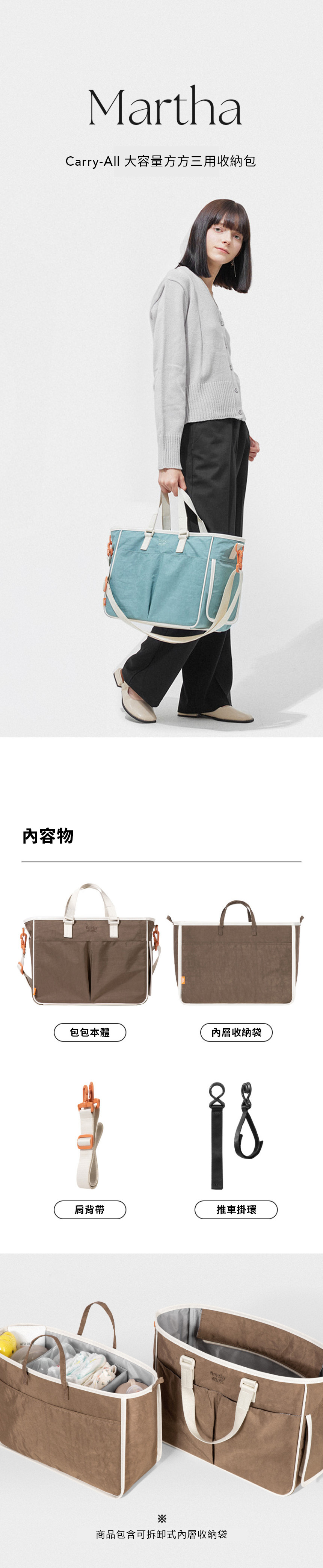 包包本體、內層收納袋、肩背帶、推車掛環